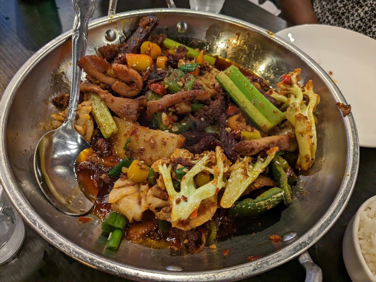 Came on Tuesday around 7 pm, The street parking was all taken, had to parked at the back of the restaurant, which could only hold about 6 cars. Wish they had a bigger parking lot. We ordered the Kung Fu boiled fish, Wok-Fried Kidney, and cabbage. The portion was generous. We almost finished the first two and had 1/2 left of the cabbage. The Kung Fu boiled fish is supposed to be a typical Sichuan-style food. But it was about the average and tasted like using pre-mixed pasted to make the broth. I know you are not supposed to drink the broth with that dish, but it affects the fish flavor. At least the fish filet was fresh and not overcooked. The wok-fried kidney is not a regular dish I order for it requires some wok and seasoning skills to remove the distinctive taste of the pork kidney with a good texture. I was surprised that they did a good job: They were freshly tender. Happy that they were smooth without the thick layer of starch-coating. The spicy flavor was well blended with the kidney and peppers. My favorite was the cabbage. The one with the least expectation. If it was not served the last, I might finish it. The wok preserved the natural sweetness of the cabbage, less spicy than the other two dishes. (I’ll say mild level ). I wish they could make it spicier though. Texture-wise, the cabbage was fully cooked but still had the crunchy freshness. Love it! Sorry to say, but the service was less exciting than the food. You order by scanning the QR code on the table. The menu is in both English and Chinese. Parking is limited, but the inside is bigger. Average level of noise. I would definitely come back to try their noodles and dry-pot series.